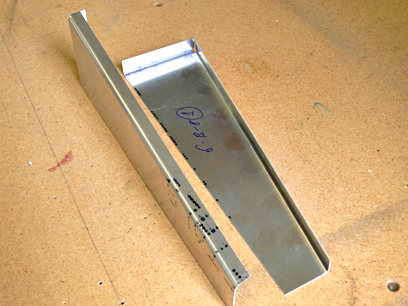 6-B-8 1 Gear Gussets Posted on December 7, 2008December 8, 2008 by Glenn Completed cutting out and bending Gear Gussets. See accompanying photos. 1.77 Hours. After cutting blanks, long flange is bent using extra width. Note holes for brake bolts to pass through. Trimming off the excess after bending. Drilling through the excess on the end flange. Checking for square before bending. Bend in process. The completed item