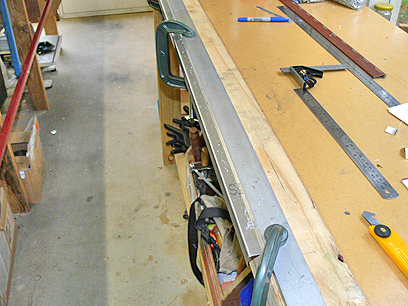 Standard Angles Posted on November 23, 2008August 28, 2024 by Glenn Complete bending channels prior to cutting down the middle to form angles. U-channels ready for cutting Cramped in the jig with straightedge during cutting The finished item 4.83 Hours.